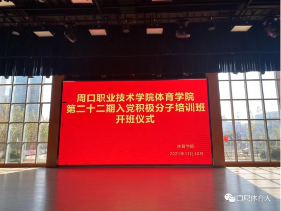 在党中央召开十九届六中全会之际,周口职业技术学院体育学院于2021年11月10日举行第二十二期入党积极分子培训班开班仪式。本次培训班是遵照发展党员细则,按照校党委要求,由周口职业技术学院体育学院党总支精心筹备举办。